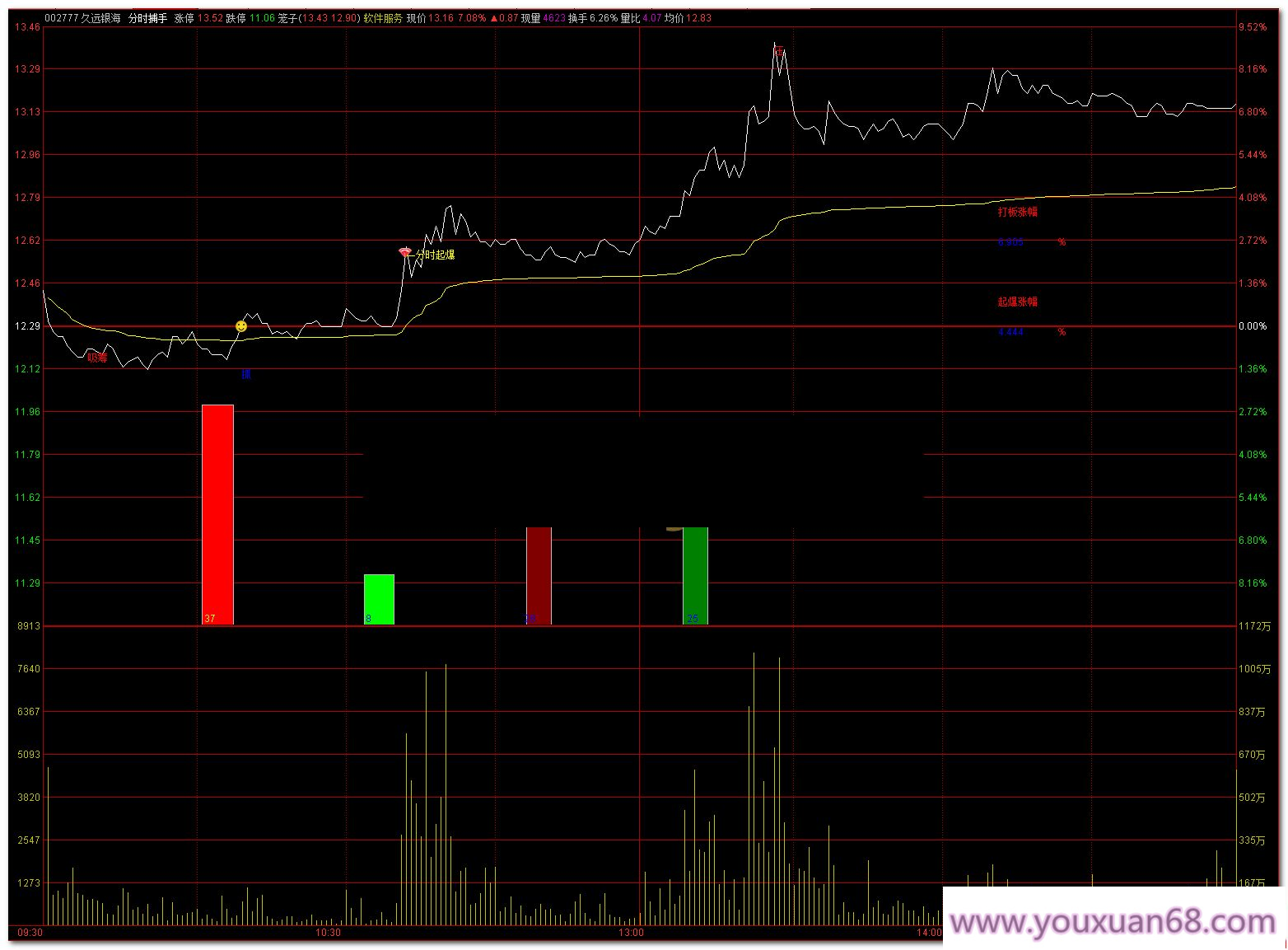 “突”信号:持续买入的标志:当主力持续性买入、资金不断涌入时,系统将通过“突”信号提醒你,这是一个强烈的买入时机,意味着市场有进一步拉升的潜力。